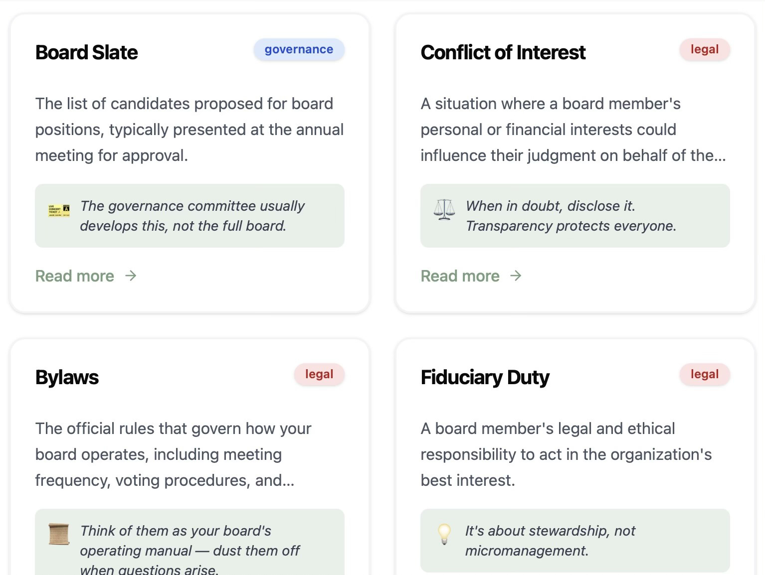 The Search Bar: The big search bar at the top of the homepage is there for that moment when someone around the table uses a term that you’ve never heard before. ‘Fiduciary duty?’ ‘Consent agenda?’ Just type it in and get a plain-English (or Spanish) translation back in seconds.