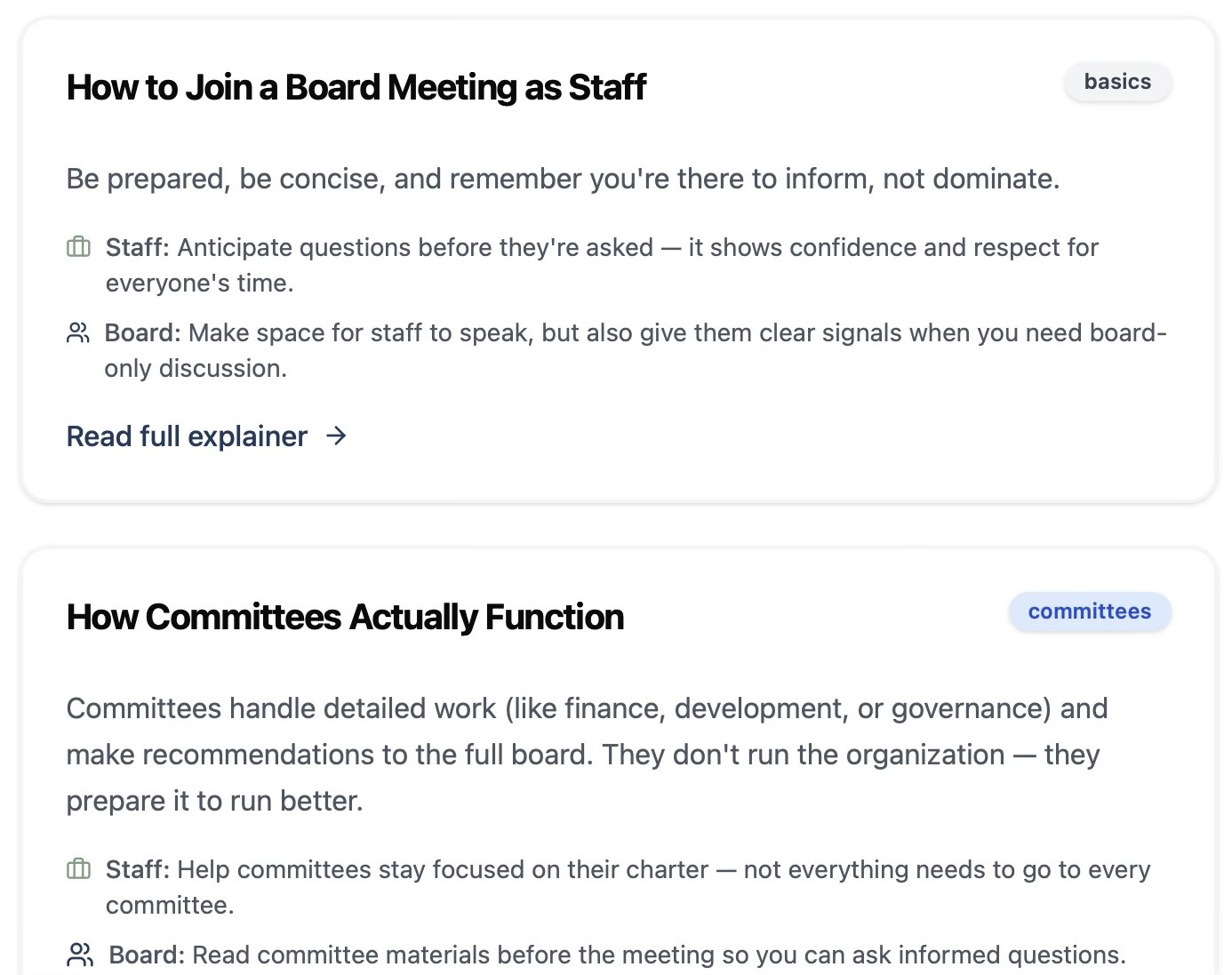 “Board Translator helps nonprofit staff and board members speak the same language. It’s a plain-English glossary and guide that demystifies board governance — from executive sessions to budget approvals. Search key terms, explore short explainers, and learn how boards and staff actually work together.”